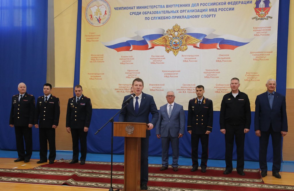 С приветственным словом к участникам обратились министр спорта Алтайского края Иван Нифонтов, начальник Барнаульского юридического института МВД России полковник полиции Дмитрий Симоненко, врио начальника Главного управления МВД России по Алтайскому краю генерал-майор полиции Марк Левин, первый заместитель Председателя АКОО ОГО ВФСО «Динамо» Алексей Минин, главный судья соревнований полковник полиции Алексей Балев.