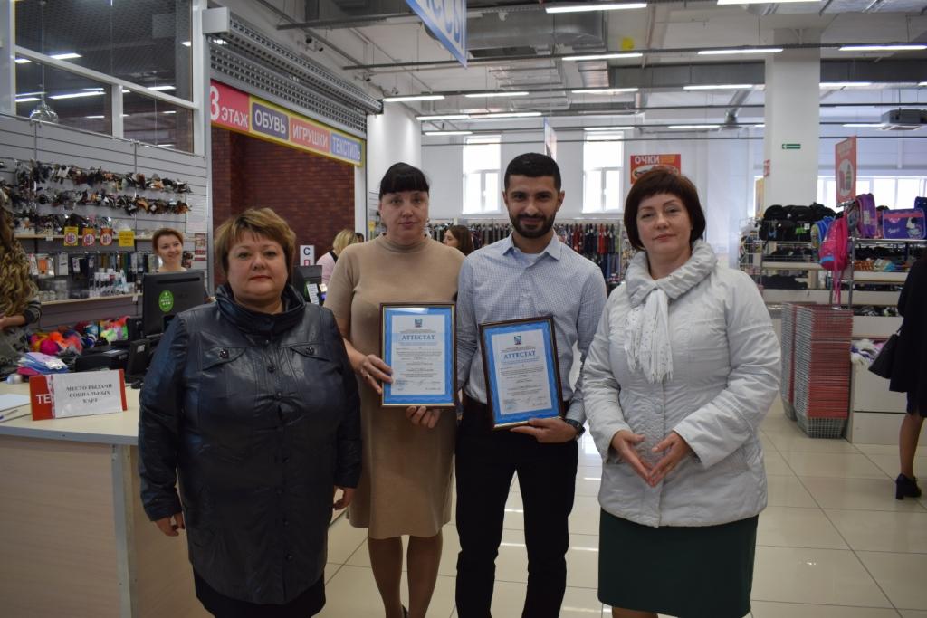 Заместитель председателя комитета по развитию предпринимательства, потребительскому рынку и вопросам труда администрации города Барнаула Наталья Чмерева вручила аттестат социального непродовольственного предприятия розничной торговли руководителю магазина.
