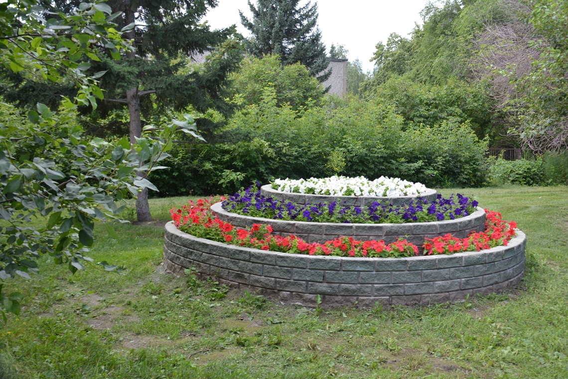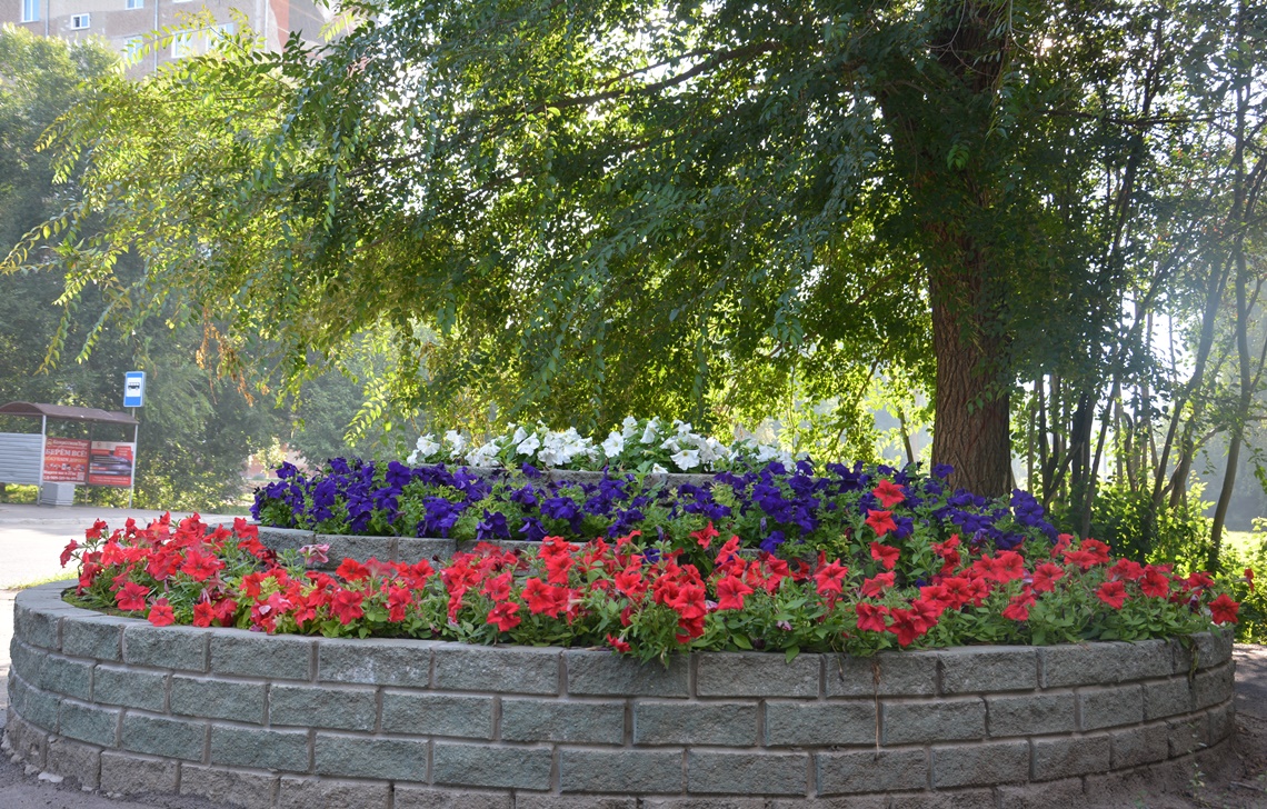 На остановке «Институт культуры» расположилась новая трехъярусная цветочная клумба из рваного камня, оформленная петуниями в цвет российского флага.