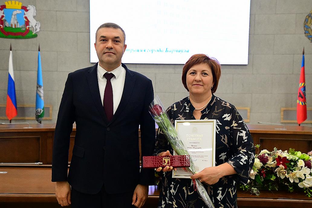В рамках торжественного мероприятия председатель комитета по предпринимательству, потребительскому рынку и вопросам труда Наталья Кротова вручила награду победителю городского конкурса «Лучший предприниматель города Барнаула -2023» в номинации «Лучший предприниматель в сфере торговли» Любови Леванюк, президенту компании «МейТан».