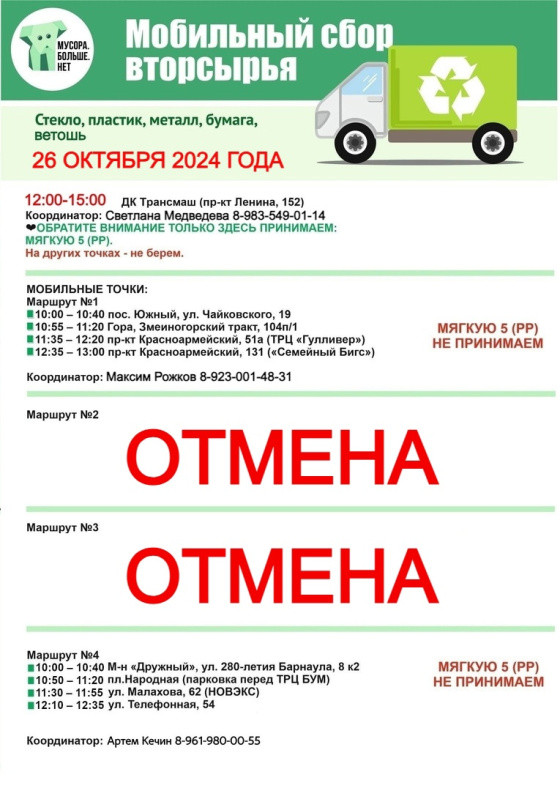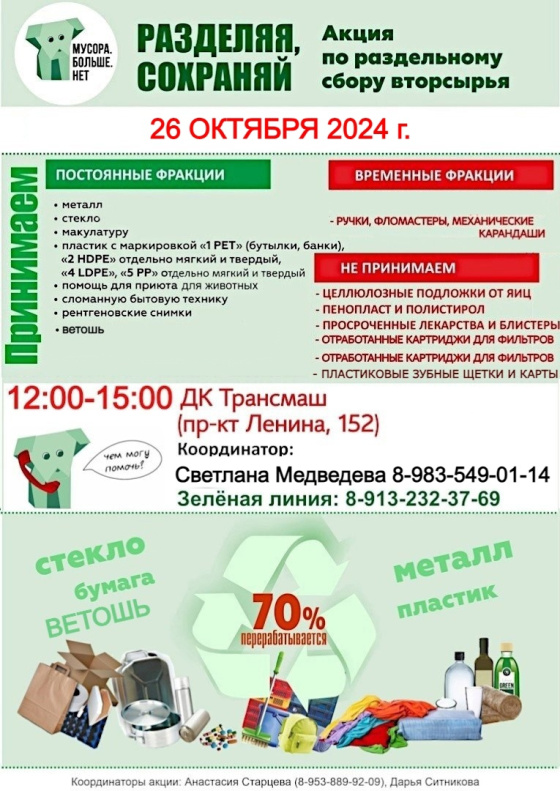 В субботу, 26 октября, в Барнауле состоится экологическая акция по раздельному сбору отходов «Разделяя сохраняй!». Организаторами мероприятия выступает общественная организация «Мусора.Больше.Нет» при поддержке комитета по благоустройству города Барнаула.