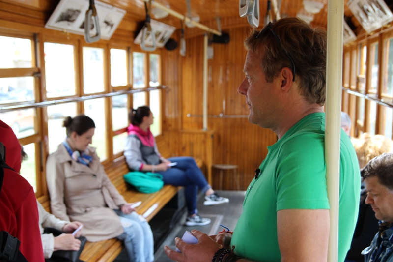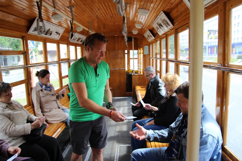 Ведущий программы «Поедем, поедим!» Джон Уоррен проехал по улицам Барнаула в салоне экскурсионного трамвая «Пятерочка»