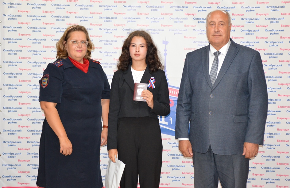 В администрации Октябрьского района паспорта вручили 15 юным барнаульцам. Школьники произнесли торжественное обещание хранить верность своей стране и быть достойными гражданами и получили свои главные документы и памятные подарки из рук главы администрации Октябрьского района Барнаула Юрия Асеева и заместителя начальника отдела по вопросам миграции отдела полиции по Октябрьскому району УМВД России по г.Барнаулу Юлии Бутаковой