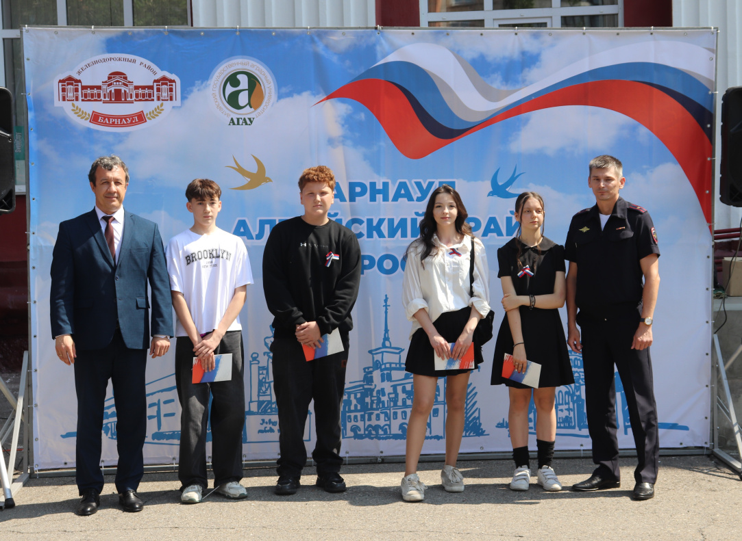 В Железнодорожном районе праздник, посвященный Дню России и вручению паспортов, состоялся на площадке перед корпусом Алтайского государственного аграрного университета. Пятеро школьников получили свой главный документ из рук главы администрации района Андрея Данькина.