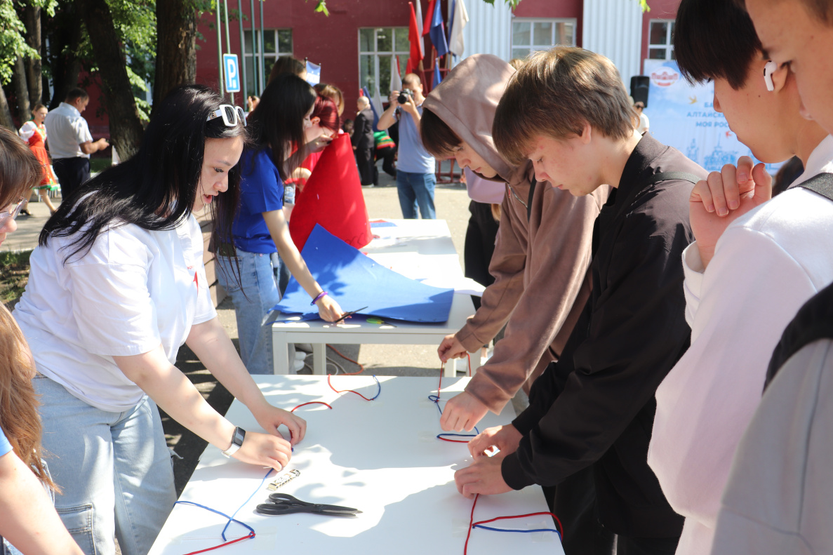 Поздравила ребят и заместитель председателя Совета регионального общероссийского движения детей и молодёжи «Движение Первых» Алтайского края Анастасия Седельникова. Также представители «Движения Первых» провели мастер-класс по плетению фенечек «триколор» и подарили школьникам обложки паспортов с символикой движения.