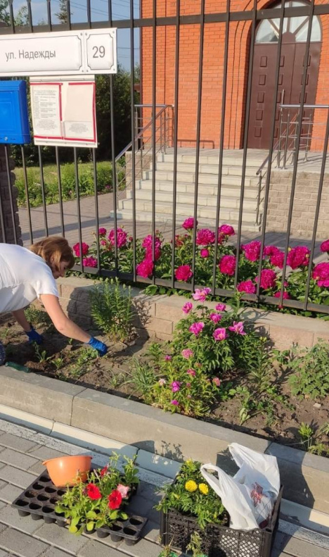 Жители поселка Казенная Заимка благоустраивают территорию храма преподобного Сергия Радонежского. Они обустраивают клумбы и высаживают цветочную рассаду.