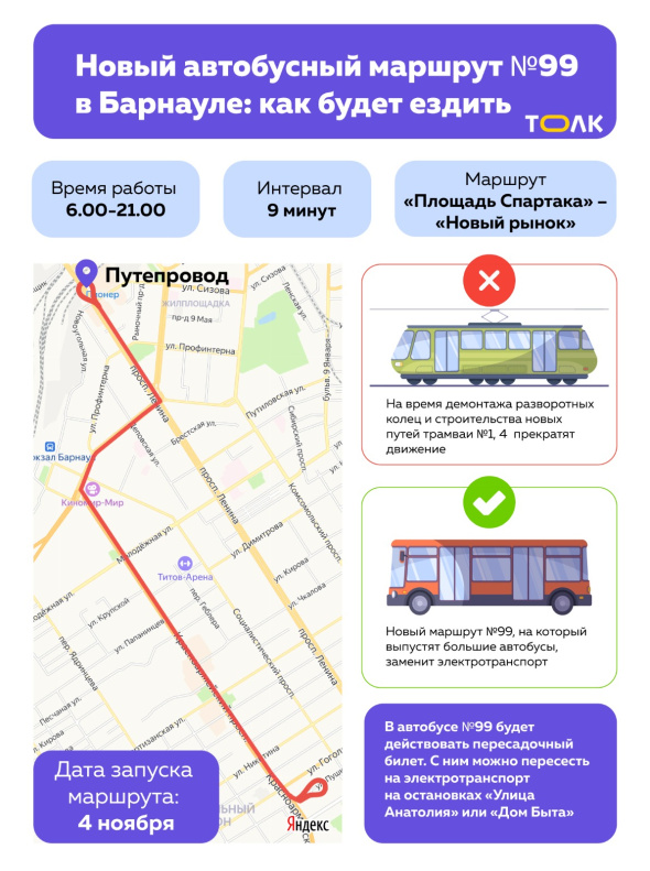 Дорожное хозяйствоДля удобства пассажиров с 4 ноября будет организован автобусный маршрут № 99, на котором можно будет добраться от остановки «Площадь Спартака» до остановки «Новый рынок» по проспекту Красноармейскому и обратно. Благодаря этому транспортное сообщение на этом участке не будет нарушено.