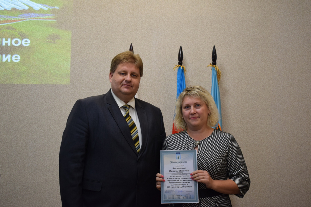 «В этом зале мы всегда собираем тех, кто внес наибольший вклад в развитие нашего района и города. Вместе с вами мы провели большой объем работ к юбилею Алтая и Дню рождения города. На территории нашего района продолжается реализация приоритетных городских проектов: выполнен ремонт на 14 участках дорог, введена новая школа, отвечающая современным требованиям, и в ней уже учатся почти 700 ребятишек. Кроме того, в поликлинике №9 отремонтированы помещения и успешно работает направление «Открытая регистратура», в поликлинике №12 также обновляется здание. К концу осени будут сданы все объекты по программе «Комфортная городская среда». И все это стало возможным благодаря вашей помощи и поддержке. Желаю вам крепкого здоровья, успехов во всех начинаниях и хорошего настроения»