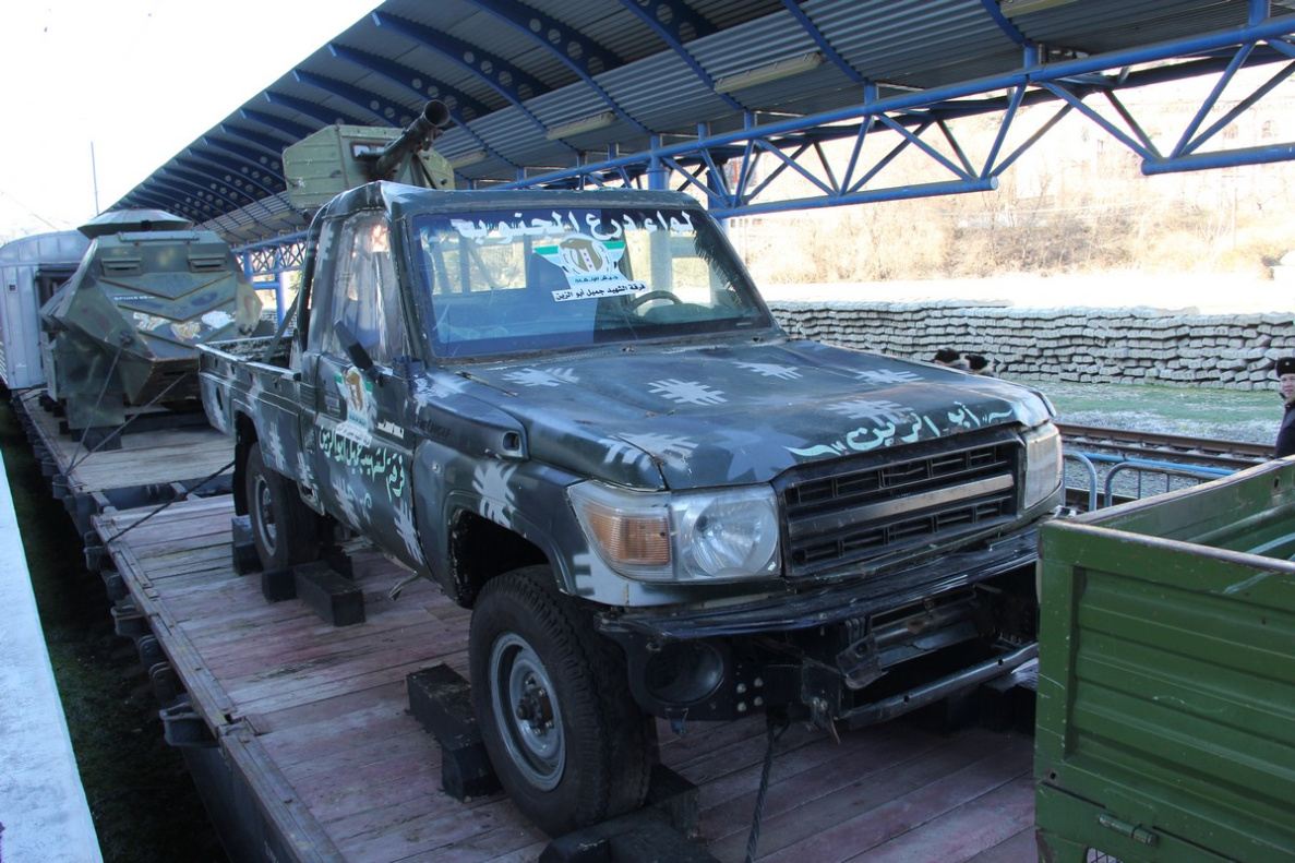 В экспозиции, к примеру, есть танк советского производства Т-55МВ, увешанный блоками динамической защиты и самодельными противокумулятивными экранами, БМП турецкого производства ACV-15, бронированный штурмовой автомобиль YPG EAGLE HEAD курдских вооруженных формирований, самоходный минный трал Aardvark JSFU, «джихад-мобиль» на базе Jeep Grand Cherokee, машина для прокладки подземных тоннелей, ракетно-артиллерийское вооружение, беспилотные летательные аппараты, холодное, огнестрельное оружие. В одном из вагонов будет развернута выставка работ военных художников и фотографов.