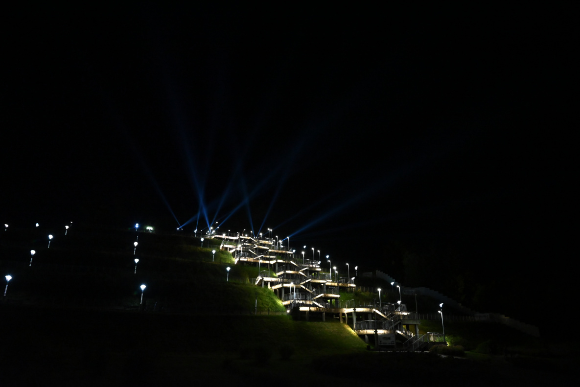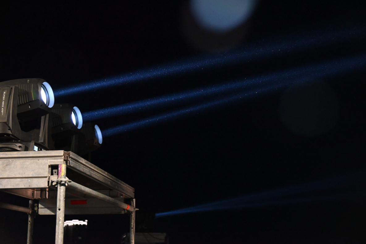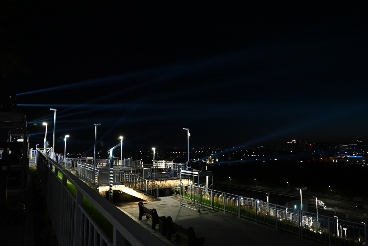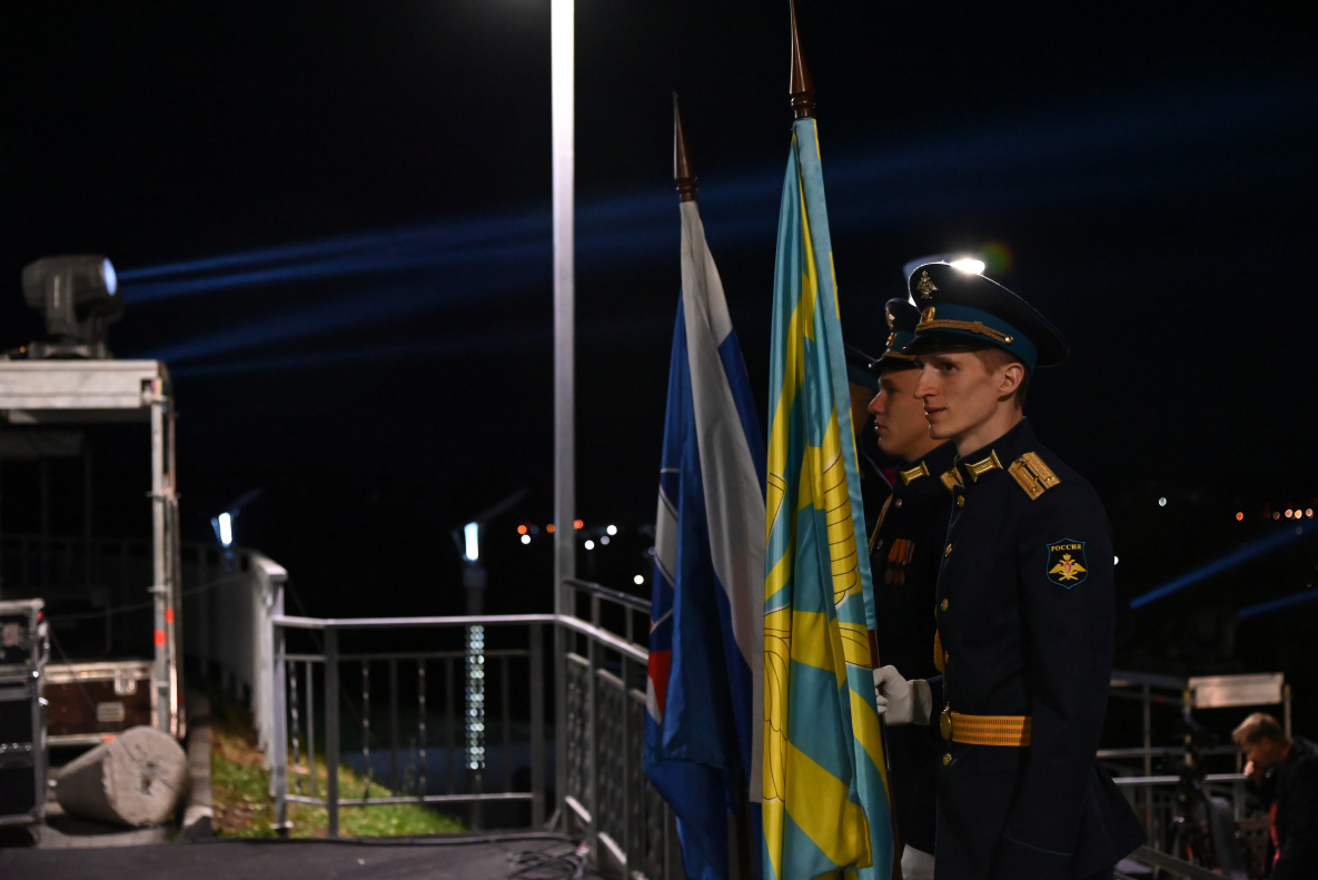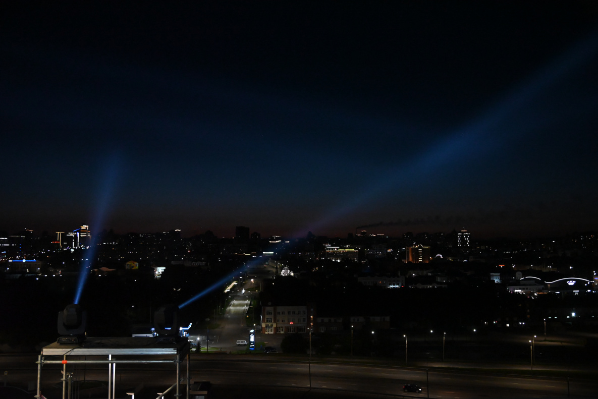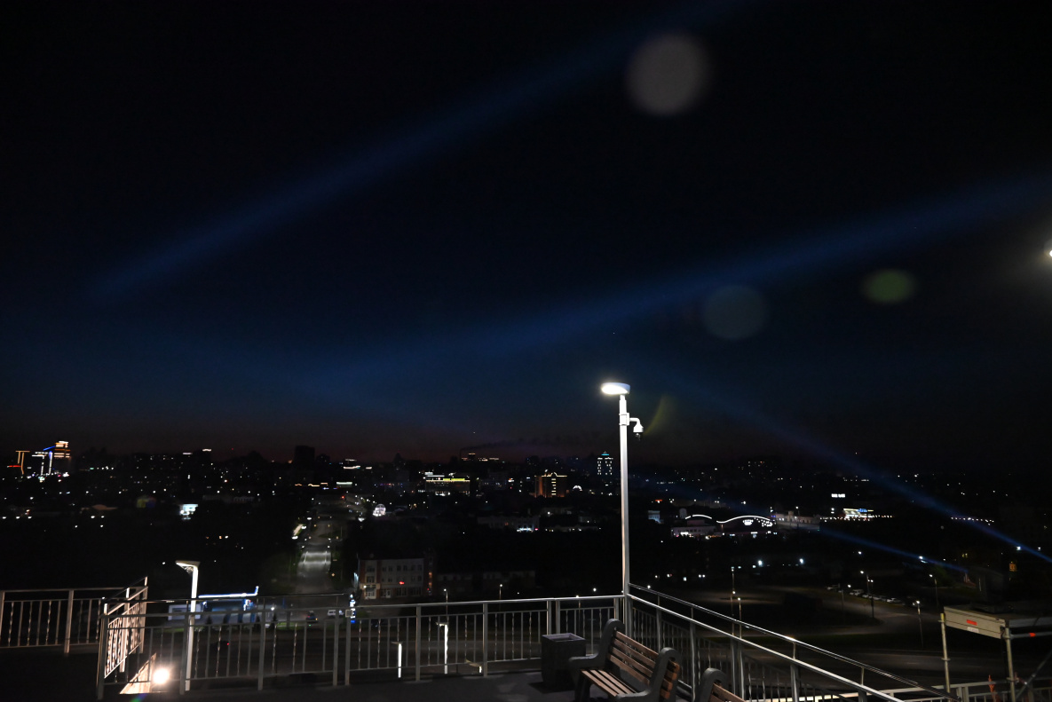 Прожекторные установки, установленные на смотровой площадке Нагорного парка, озарили небо краевой столицы. Световые лучи были видны из разных точек города.