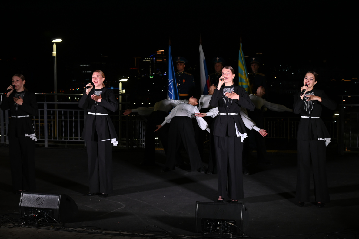 Для жителей краевой столицы, пришедших посмотреть на яркие лучи вблизи, в рамках акции на площадке Нагорного парка прошел тематический патриотический концерт. Свои номера представили танцевальные и вокальные коллективы педагогического университета в сопровождении знаменной группы войсковой части 84686.
