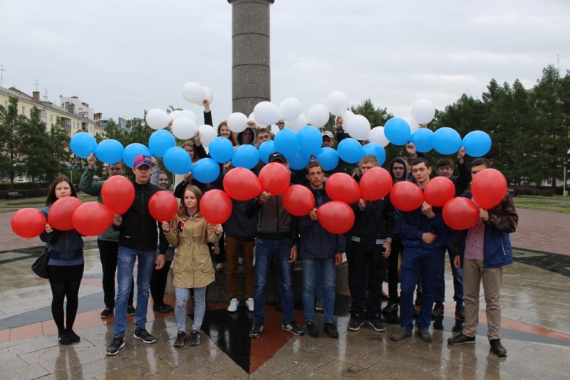 Участники мероприятия вспомнили историю праздника и прочли стихи о любви к России. В завершение акции молодые люди выстроились с воздушными шарами цветов российского флага.