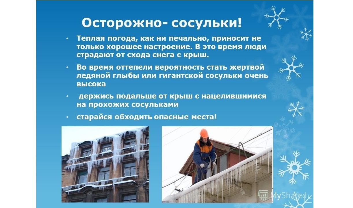 Также не следует оставлять автомобили вблизи зданий, на карнизах которых образовались сосульки и навис снег. Если ваш автомобиль поврежден, необходимо вызвать сотрудников ГИБДД и составить акт, который будет служить доказательством того, что имуществу причинен вред. Если из-за падения с крыши сосульки или снега пострадал человек, необходимо незамедлительно вызвать скорую помощь.