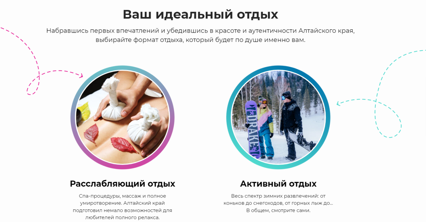 Туристы могут выбрать близкий им сценарий путешествия - активный или спокойный. Любителям релакса посоветуют спа-центры, аквапарки, сибирские бани и санатории, комфортные отели и комплексы. Для приверженцев активного отдыха - горнолыжные трассы, экскурсии на снегоходах, конные прогулки, прокаты коньков и тюбингов. На сайте также можно найти контакты проверенных туроператоров, лучшие рестораны и кафе, отзывы уже побывавших на Алтае туристов.