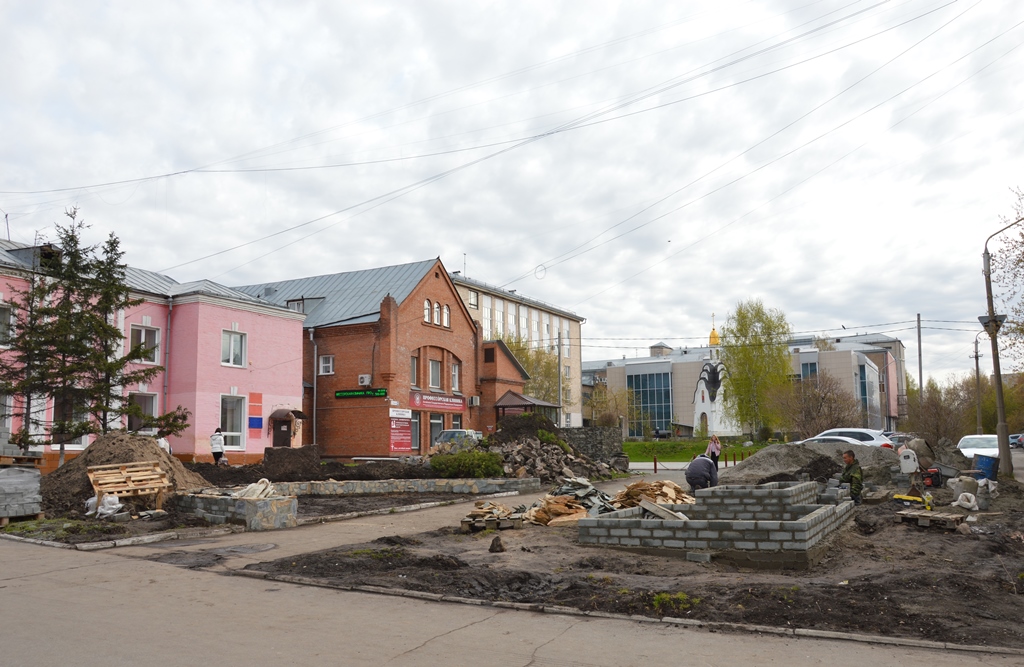 В данный момент работники подрядной организации занимаются возведением из кирпича подпорных стенок многоуровневых клумб, которые немного позже отделают камнем. Затем им предстоит уложить тротуарную плитку, установить бордюрный камень, завезти грунт, высадить цветы и кустарники, посеять газон. Также для удобства горожан здесь установят лавочки, урны и фонари наружного освещения.