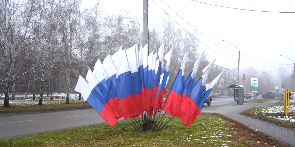 Преобразилась к празднику и пл.Мира. На ней также появились флажные конструкции, украшенные российским триколором.