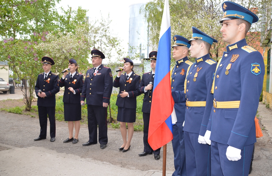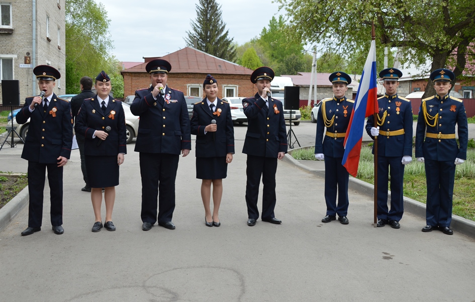 Артисты вокального ансамбля «Виват» Барнаульского юридического института МВД России совместно с ведущим Александром Рухадзе в сопровождении почетного караула военной части 84686 поздравили ветеранов с наступающим праздником Победы и исполнили песни военных лет.