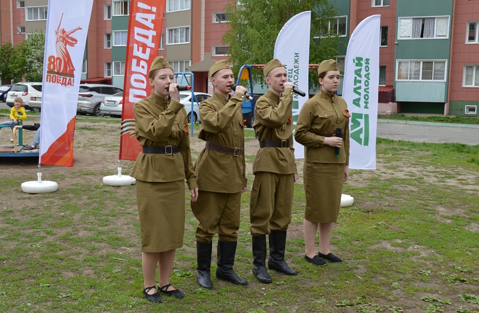 Любимые военные композиции прозвучали в исполнении вокальной группы «Вольта», солиста Ивана Михайлова и дуэта гармонистов Алтайского краевого колледжа культуры и искусств.