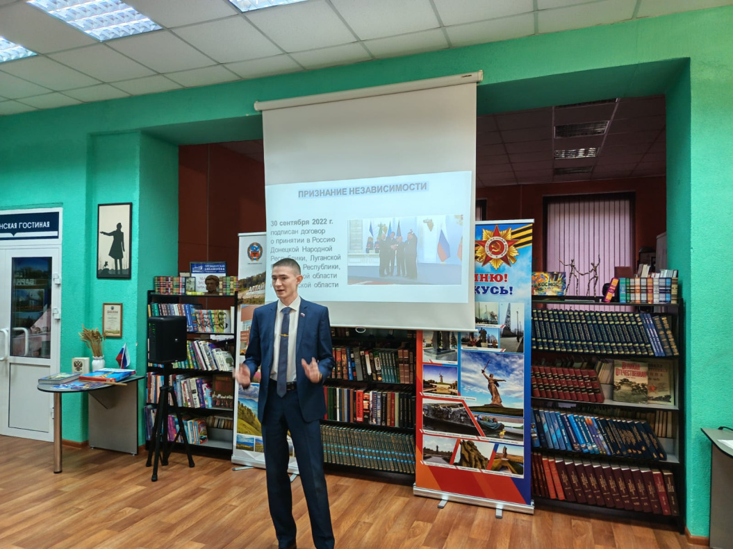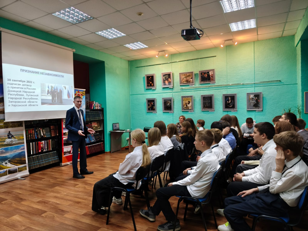 В библиотеке №10 (ул. Чайковского, 19, р.п.Южный) для учащихся 7 классов школы №76 прошла историко-познавательная программа «Мы Россия, мы вместе!», приуроченная ко Дню воссоединения Донецкой Народной Республики, Луганской Народной Республики, Запорожской области и Херсонской области с Российской Федерацией.