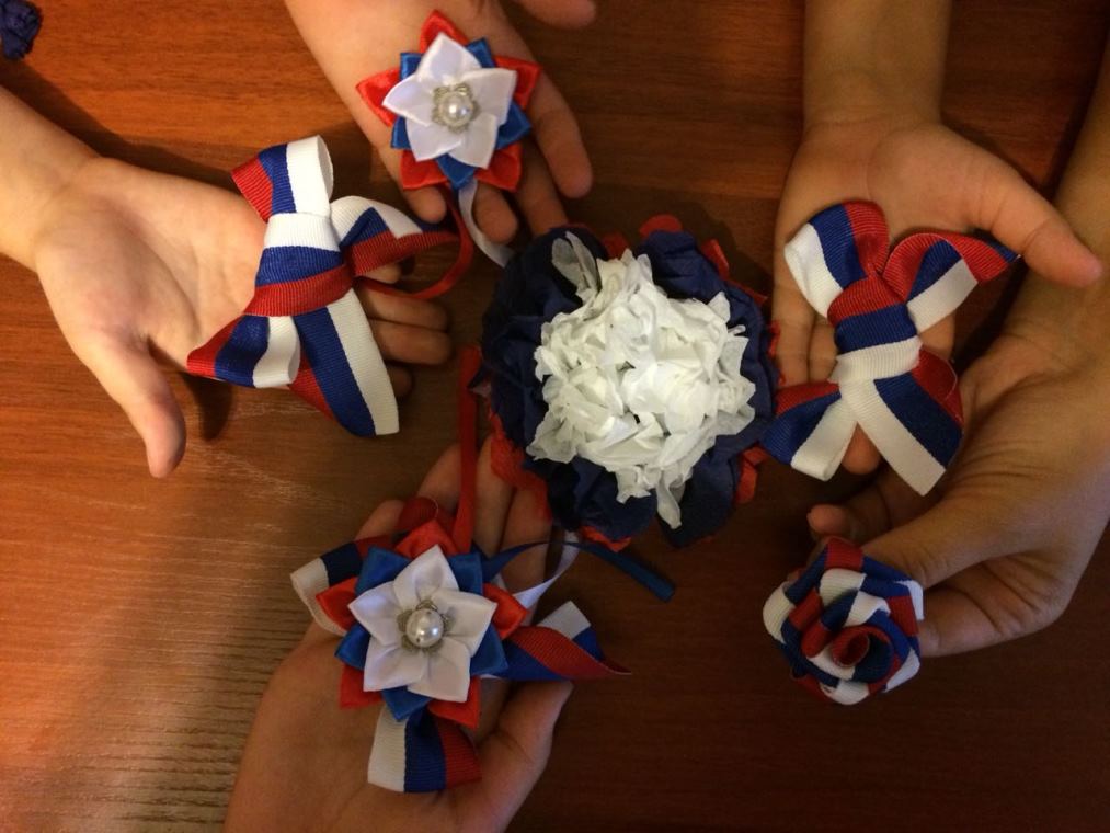 Из ленточек-триколор и подручного материала: лент, бусин, цветной бумаги, картона и даже салфеток девочки изготовили 25 праздничных брошей трех видов.