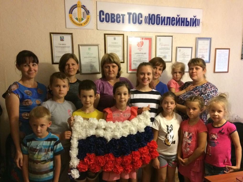 В завершении мероприятия дети и взрослые провели фотосессию с российским флагом, выполненным здесь же, но уже из 58 бело-сине-красных салфеток, превратившихся в руках умельцев в цветы.