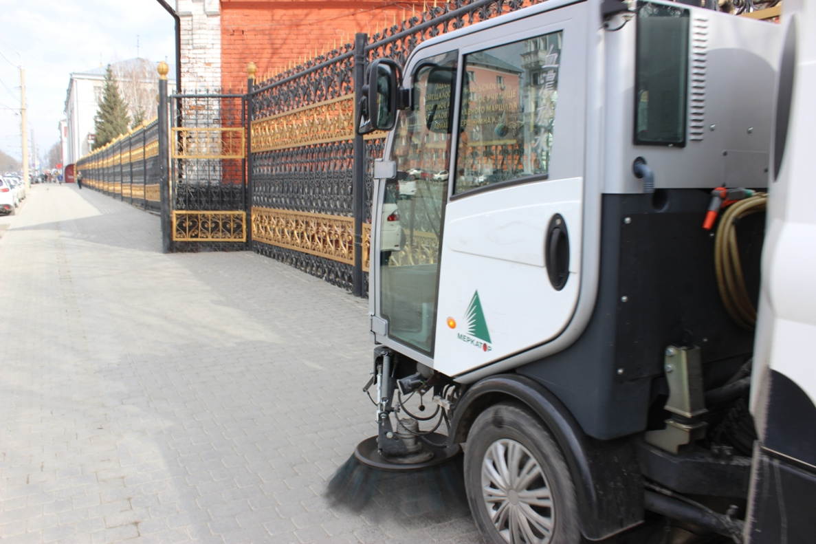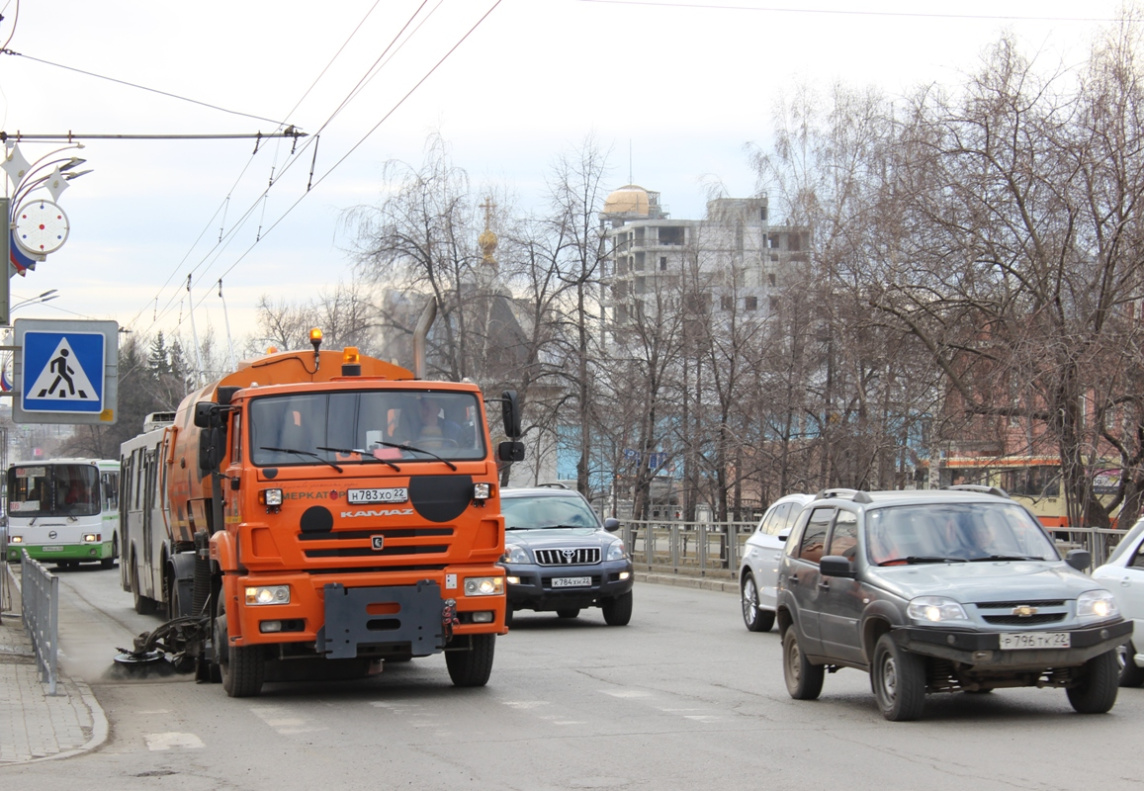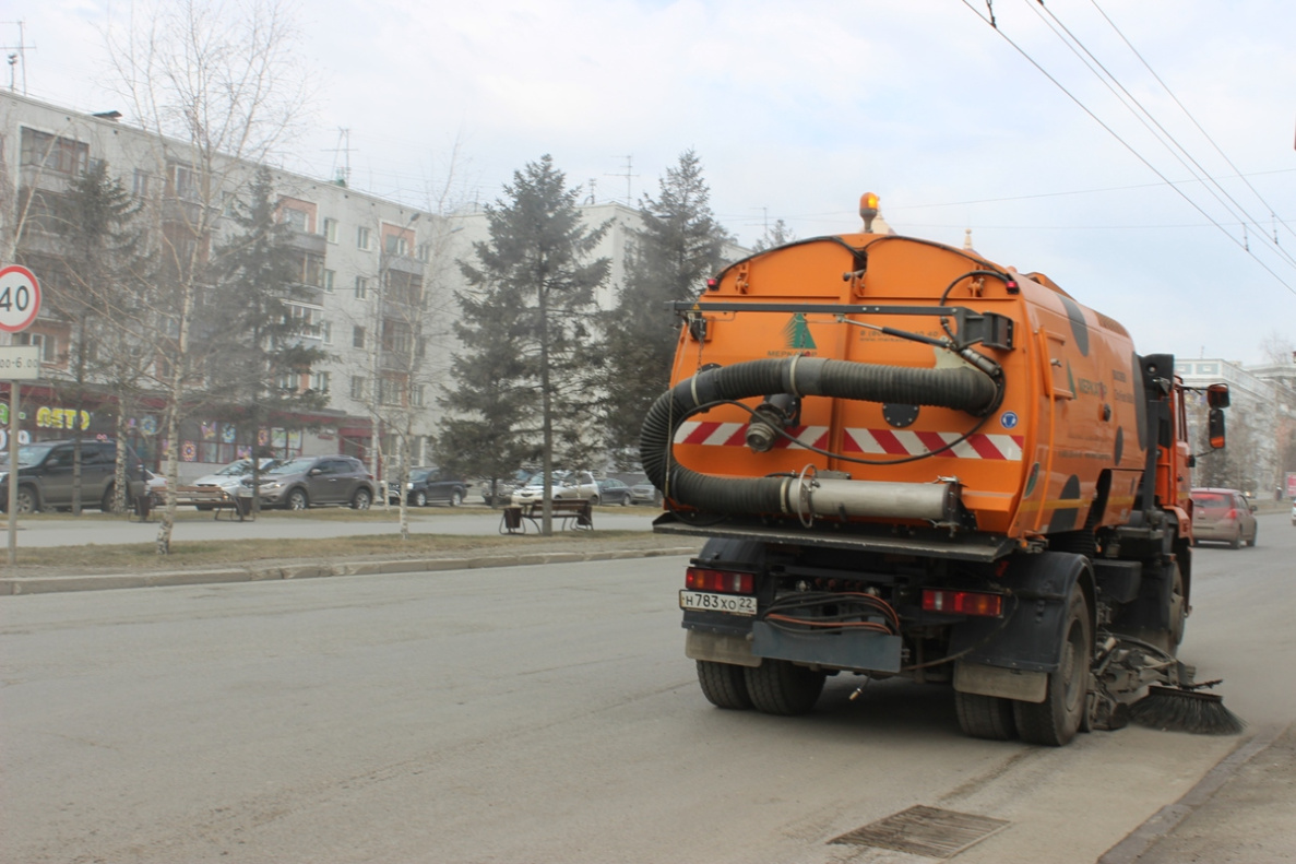 Коммунальная спецтехника очищает от пыли дороги и тротуары Барнаула