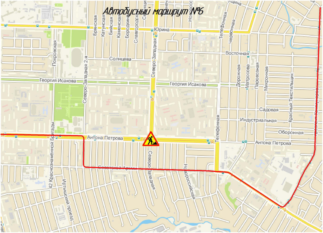 4) схема автобусного маршрута №6: …пр-кт Коммунаров – ул.Советской Армии – ул.Северо-Западная 2-я – ул.Антона Петрова, далее по маршруту; в обратном направлении без изменений.