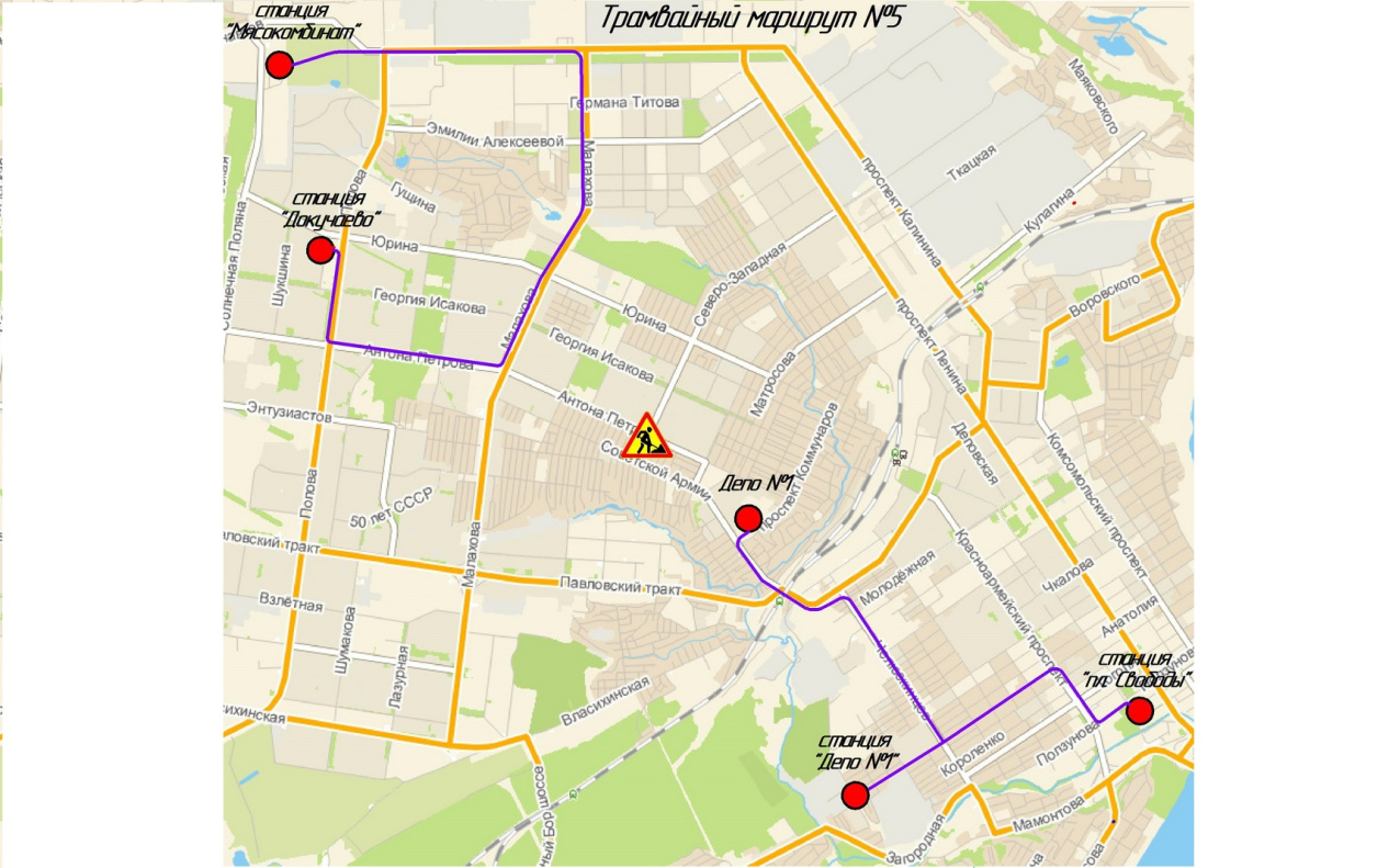 1) схема трамвайного маршрута №5: ст.«Мясокомбинат» – пр-кт Космонавтов – ул.Малахова – ул.Антона Петрова – ул.Попова – ст.«Докучаево»; Депо №1 (пр-кт Коммунаров, 128) – ул.Челюскинцев – ул.Анатолия – пр-кт Красноармейский – ул.Ползунова – ст.«пл.Свободы»;