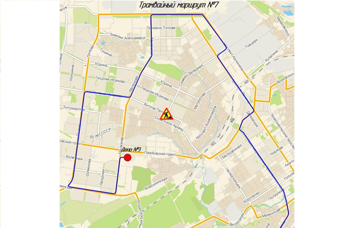 2) схема трамвайного маршрута №7: Депо №3 (ул. Гридасова, 5) – ул.Малахова – ул.Власихинская – ул.Попова – ул.Антона Петрова – ул.Малахова – пр-кт Космонавтов – пр-кт Ленина далее по маршруту.
