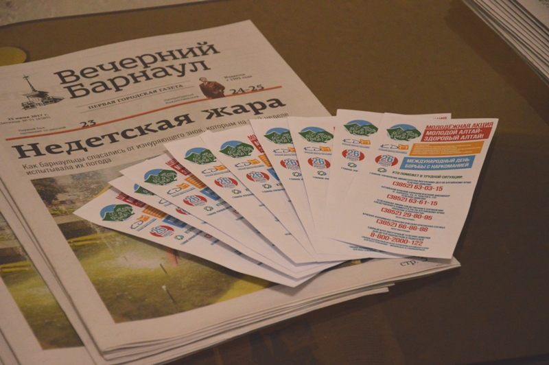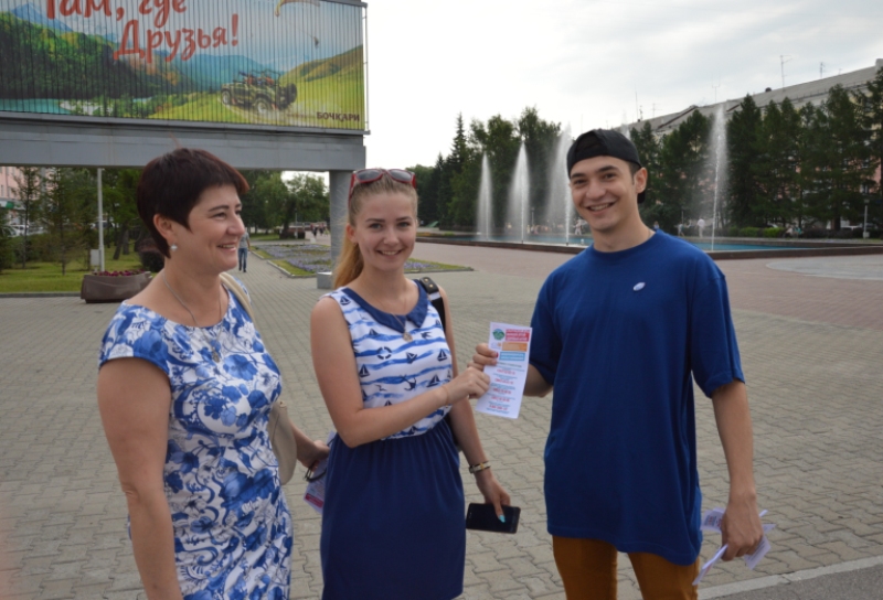 Акция «Молодой Алтай – Здоровый Алтай», посвященная Международному дню борьбы с наркоманией, проводится на территории всего города. Представители Молодежного Совета Октябрьского района и волонтеры Алтайского промышленно-экономического колледжа раздавали горожанам информационные буклеты, которые рассказывают о негативных последствиях наркотической зависимости и учат сказать «Нет» наркотикам.
