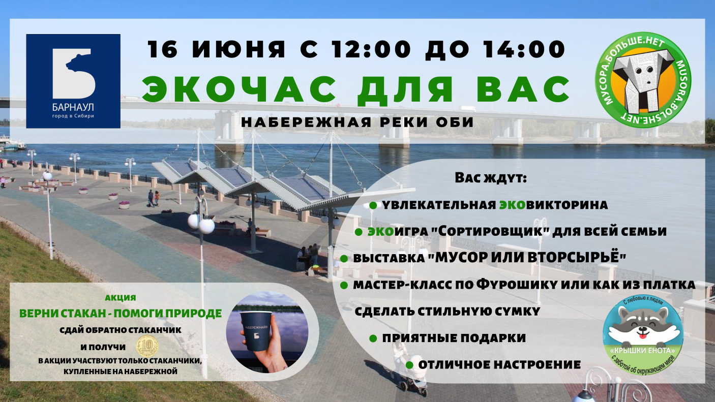 Барнаульцев и гостей города 16 июня с 12.00 до 14.00 ждут на набережной Оби для участия в экологической акции «Экочас для Вас»!