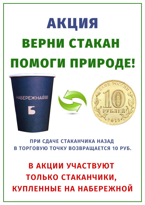 В рамках акции «Экочас для Вас» пройдет сбор стаканчиков. Можно будет вернуть в торговую «точку» пустой стаканчик из-под напитка, купленного на набережной в этот день и получить 10 рублей.
