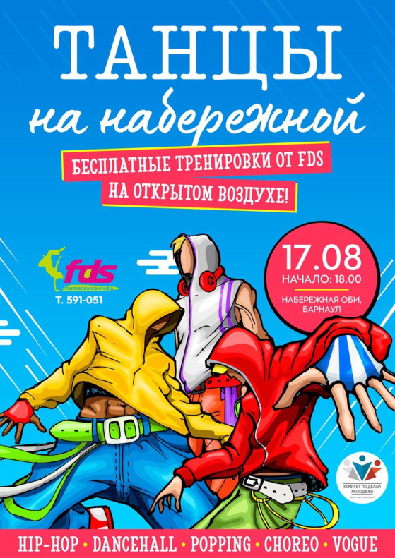 В субботу, 17 августа, в краевой столице состоится молодежное мероприятие «Танцы на набережной». Бесплатные тренировки на открытом воздухе будут проводить преподаватели первой школы уличных танцев в г. Барнауле Format Dance Studio.