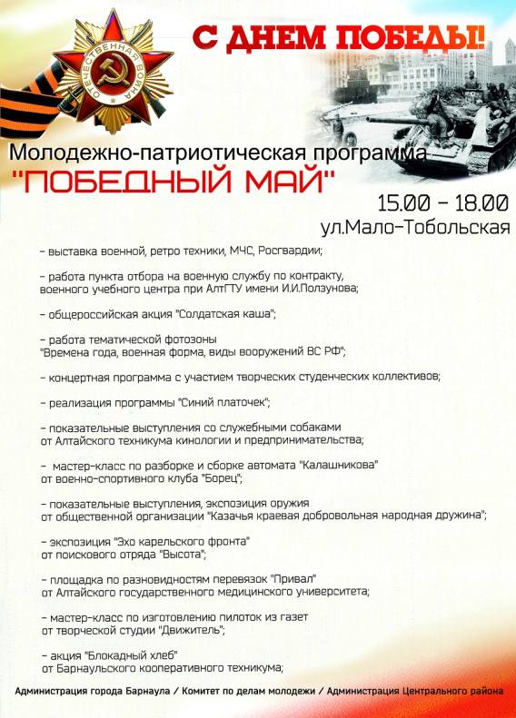 В рамках празднования 74-й годовщины Победы в Великой Отечественной войне 9 мая в 15.00 на пешеходной улице Мало-Тобольской состоится молодежное патриотическое мероприятие «Победный май».