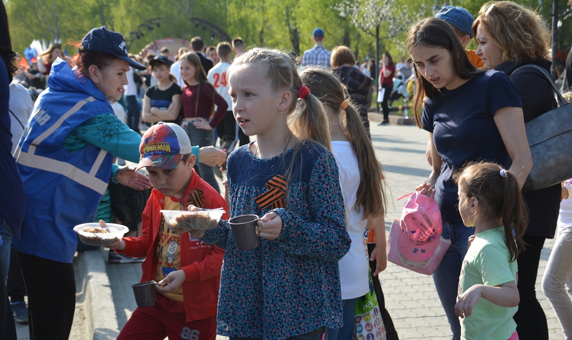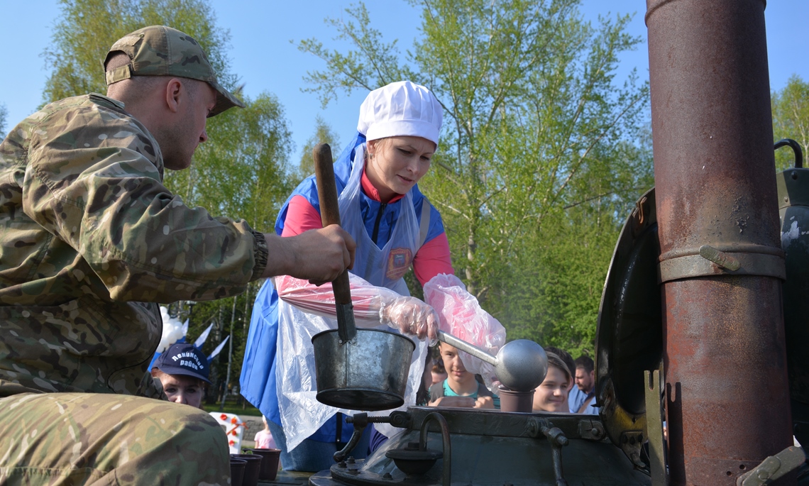 Ветеранские организации развернули на площади полевой госпиталь, а управление Росгвардии по Алтайскому краю и Барнаульский молочный комбинат угостили желающих солдатской кашей.