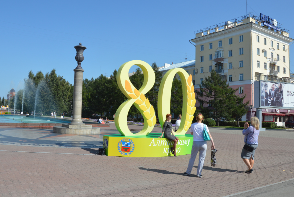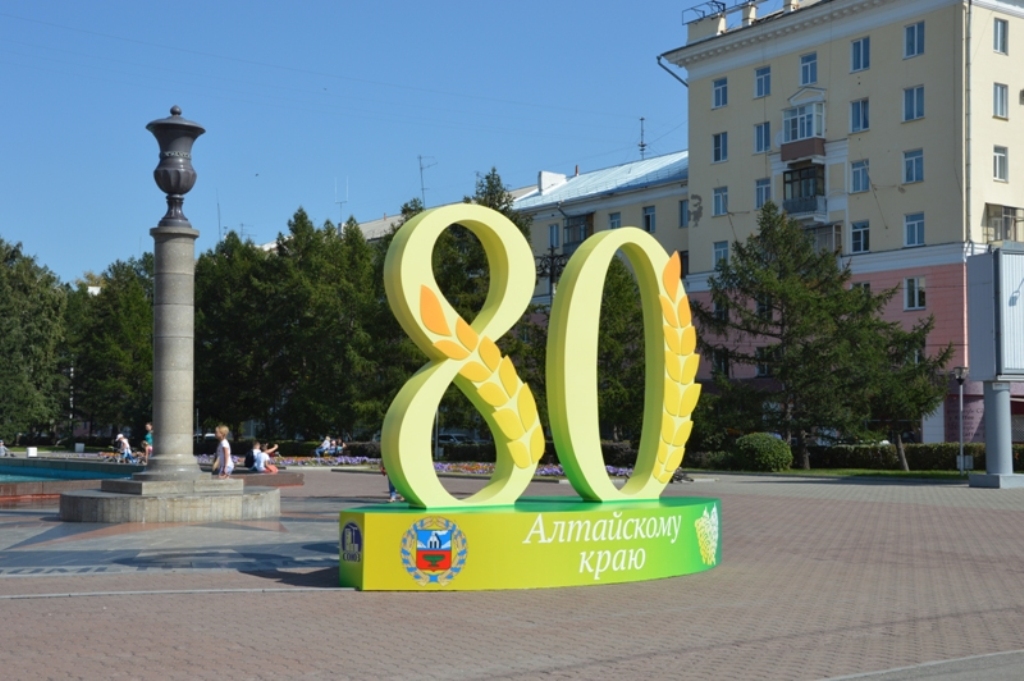 К юбилею Алтайского края по инициативе администрации Октябрьского района работники инвестиционно-строительной компании «Союз» сделали и установили сегодня на площади Ветеранов почти четырехметровую железобетонную конструкцию из двух цифр – 8 и 0. Малая архитектурная форма, символизирующая 80 лет со дня образования края, облицована пластиком, с внутренней стороны оборудована светодиодной подсветкой.