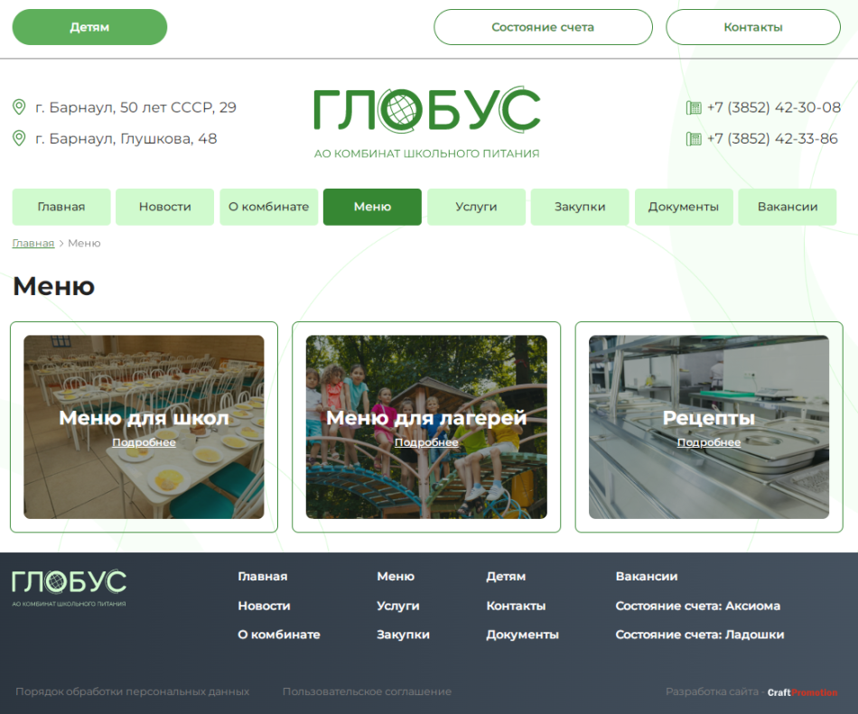 В «Меню» можно ознакомиться с перечнем блюд, предлагаемых комбинатом для школ и лагерей. Специалистов, ищущих работу, может заинтересовать раздел «Вакансии».