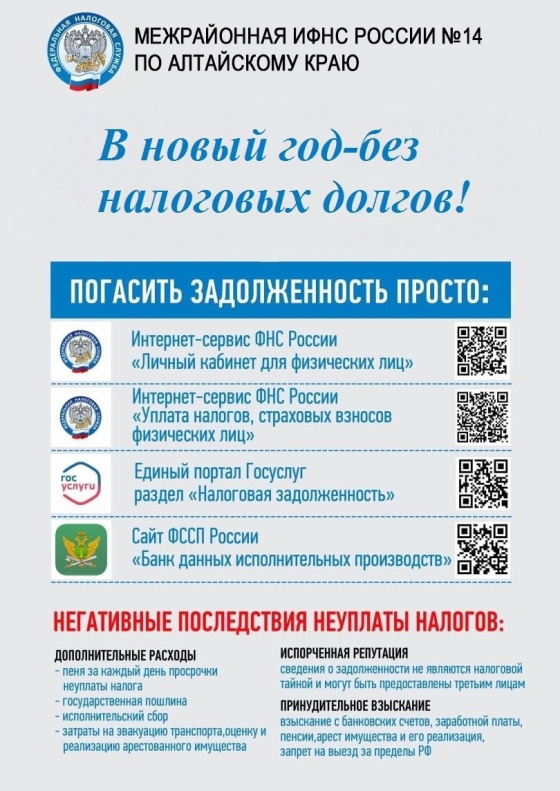 Межрайонная ИФНС России № 14 по Алтайскому краю информирует жителей Октябрьского района о возможности проверить и погасить налоговую задолженность в электронном формате.