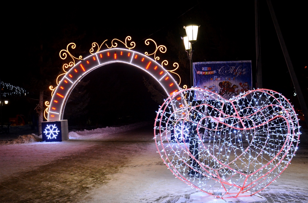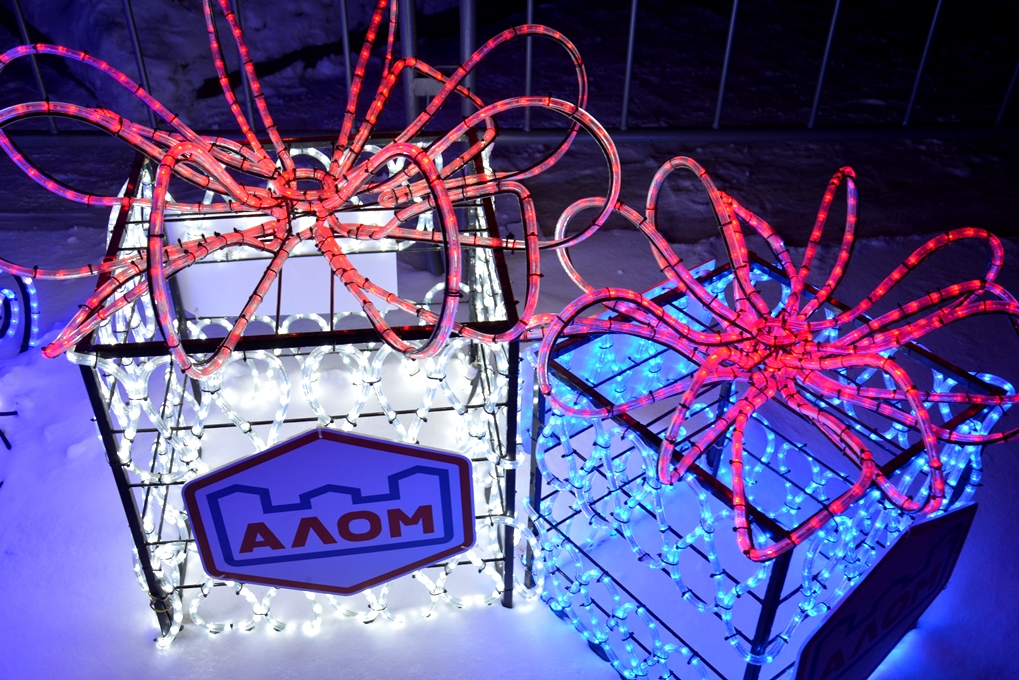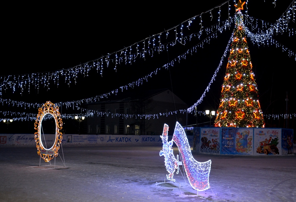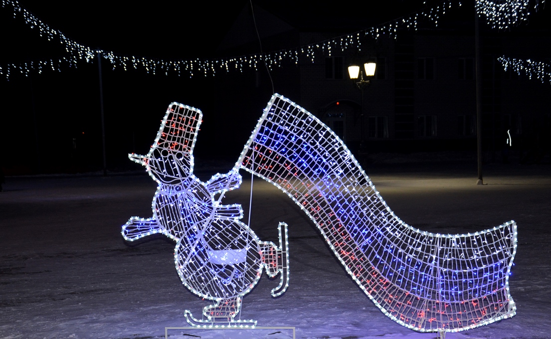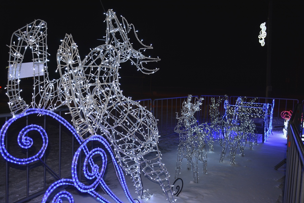 Новогодний городок украсили световые фигуры: «Олень малый», «Олень большой», «Карета с игрушками», «Зеркало», «Сердце», «Ель малая», «Снеговик», «Шар», «Арка», «Снеговик с флагом триколор». Дополнительно будут установлены фигуры ёлочки, Деда Мороза и Снегурочки.