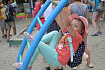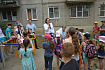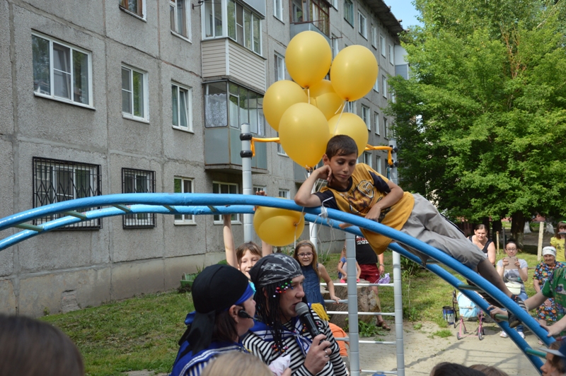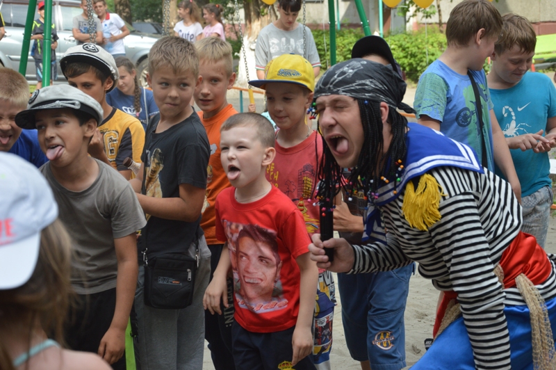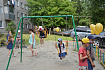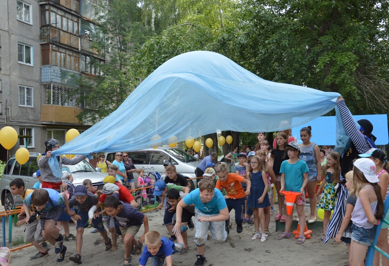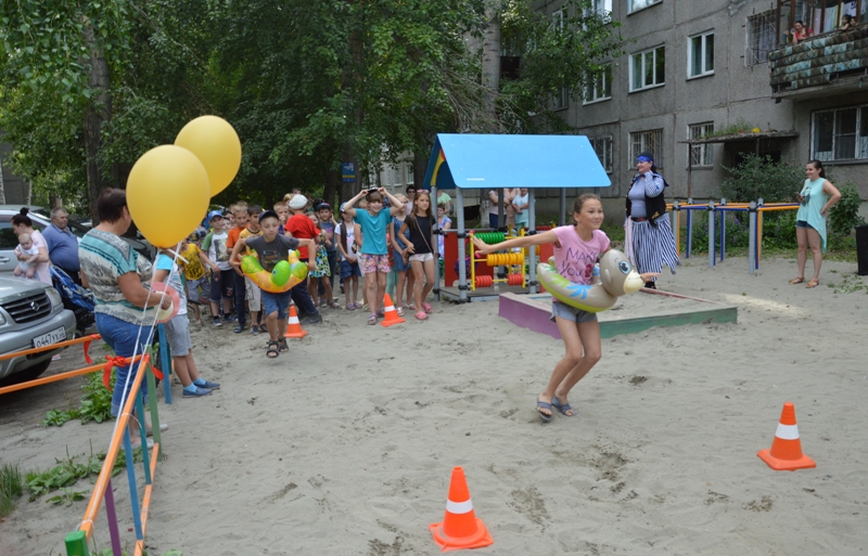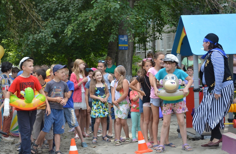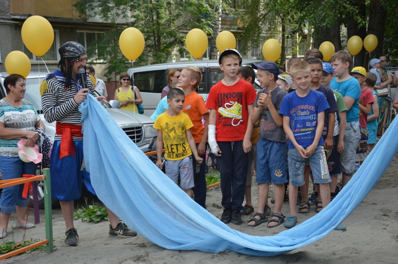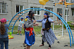 На празднике по случаю открытия площадки для детей организовали игровую программу с аниматорами и музыкой.