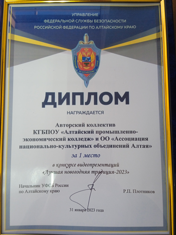 I место занял авторский коллектив КГБПОУ «Алтайский промышленно-экономический колледж» совместно с ОО «Ассоциация национально-культурных объединений Алтая» с проектом межнационального фестиваля «Дружба народов»;