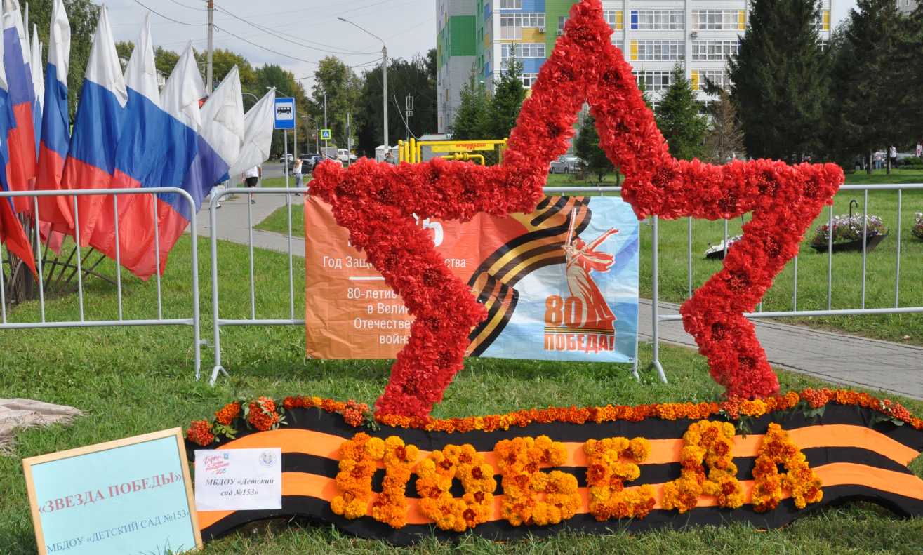 Цветочные композиции подготовили предприятия промышленности и потребительского рынка, управляющие организации. Свою фотозону с четвероногими питомцами представило БГОО «Ласка».