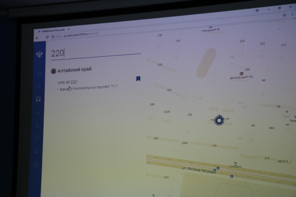 Возможности данного портала были продемонстрированы на базе участковой избирательной комиссии №220 (общежитие ФГБОУ ВО «Алтайский государственный технический университет им. И.И.Ползунова», пр-кт Комсомольский, 71).