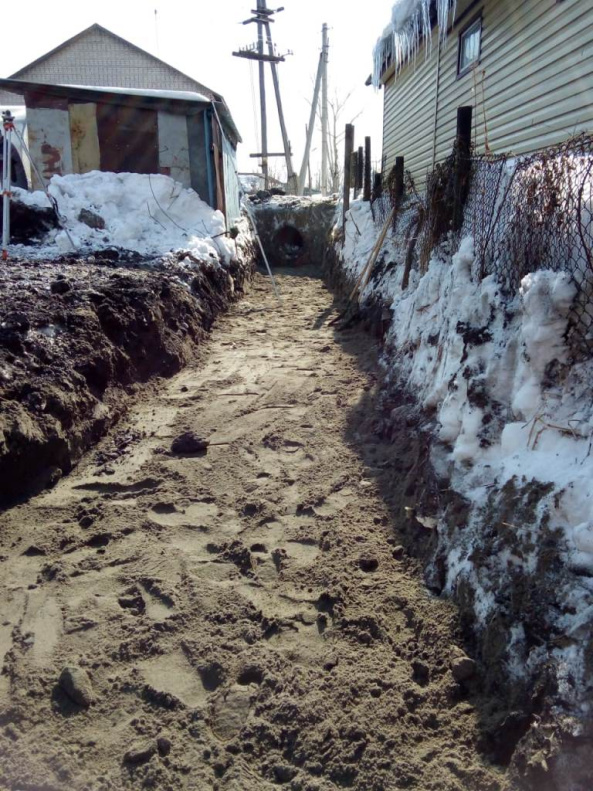 В селе Лебяжье ведутся работы по укладке водоотводных лотков от улицы Центральной до улицы Школьной.