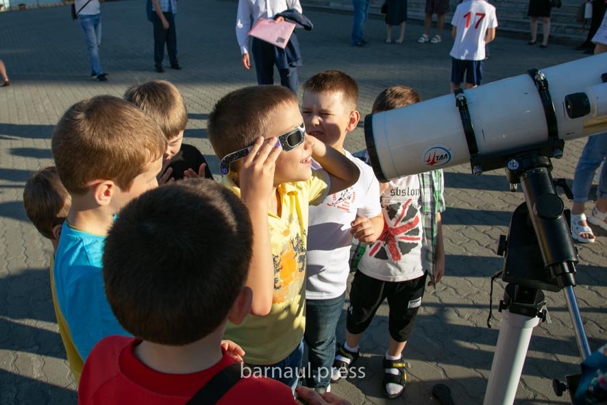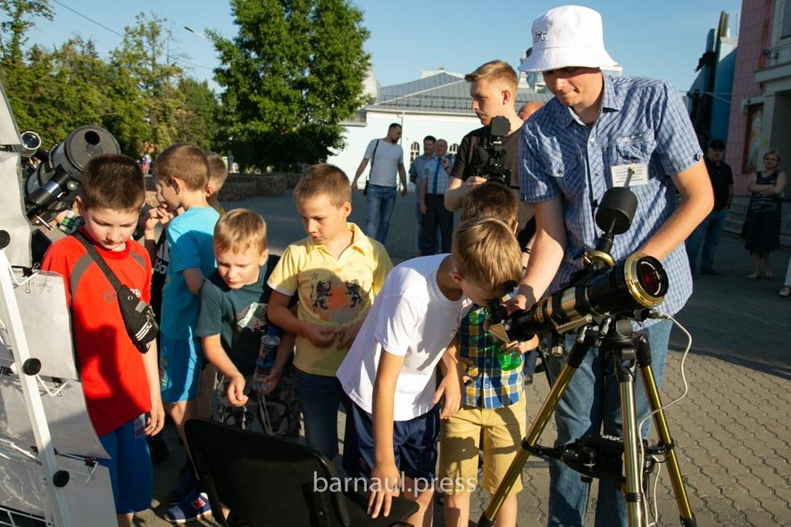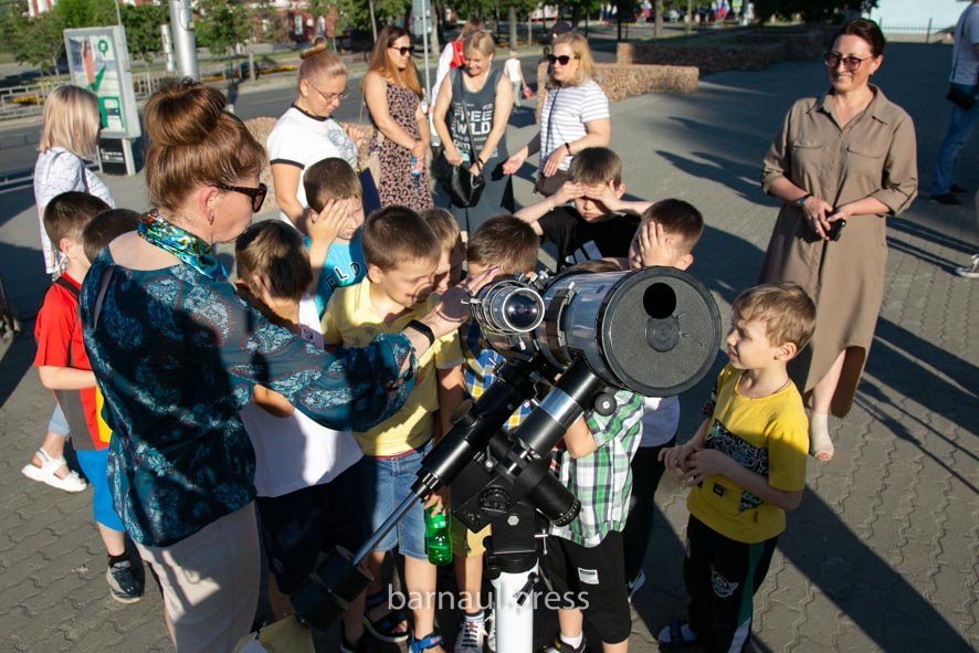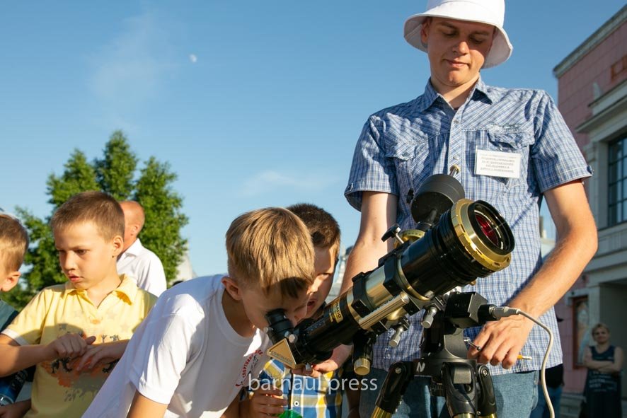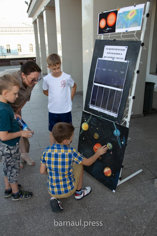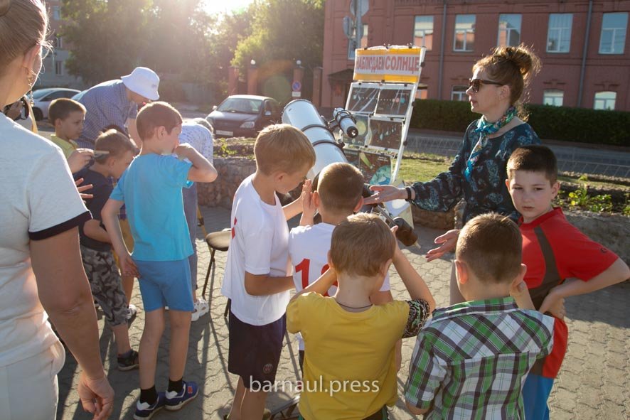 На площадке перед планетарием ребята рассмотреть в телескоп посмотреть на Солнце и Луну. Потом они посмотрели мультимедийные программы "Планета Динозавров" и «Дракоша и пропавшая звезда".