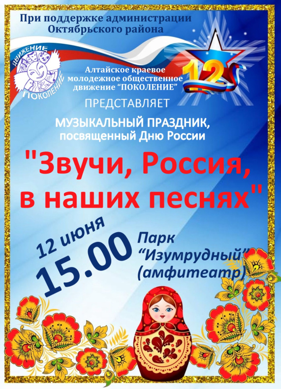 С 15:00 в амфитеатре парка пройдёт музыкальная программа «Звучи, Россия, в наших песнях», которая будет организована Алтайским краевым молодёжным общественным движением «Поколение».