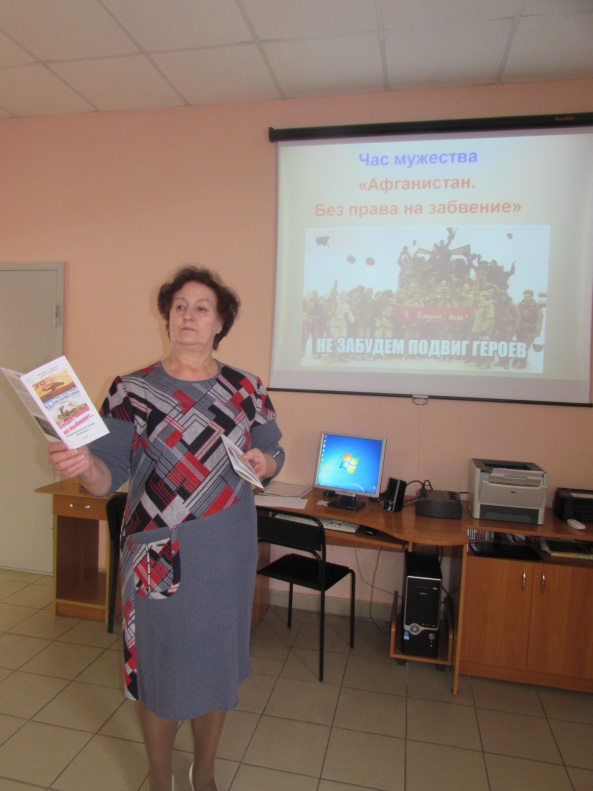 В ходе мероприятия школьникам были представлены видеофрагменты документальных фильмов о непростой истории Афганской войны. Каждому пришедшему на урок мужества был вручен рекомендательный список литературы «Солдат войны не выбирает».