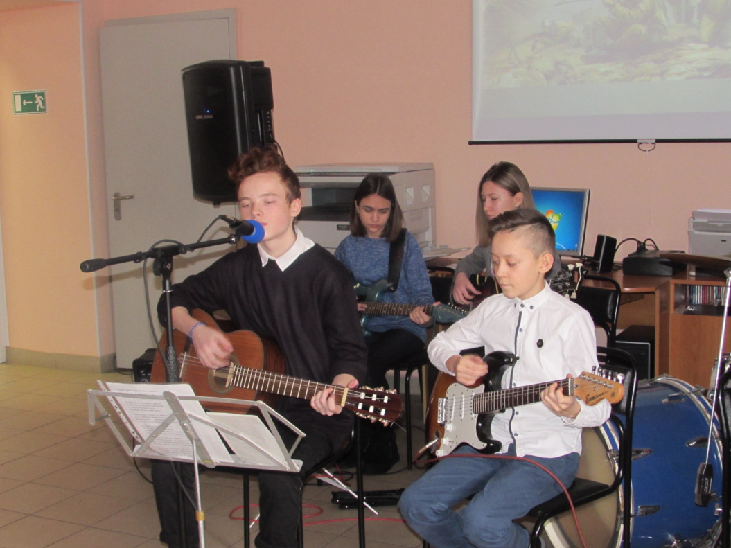 Особый эмоциональный фон на уроке мужества создавали своим творчеством учащиеся инструментального ансамбля детской школы искусств №6. В их исполнении прозвучали песни афганского цикла: «Кукушка», «Расплескалась синева».