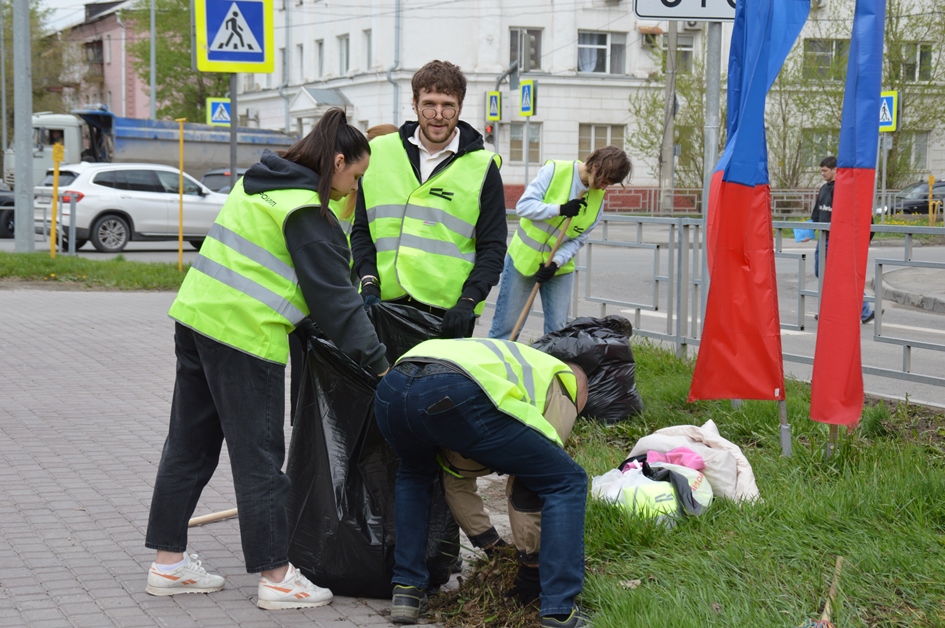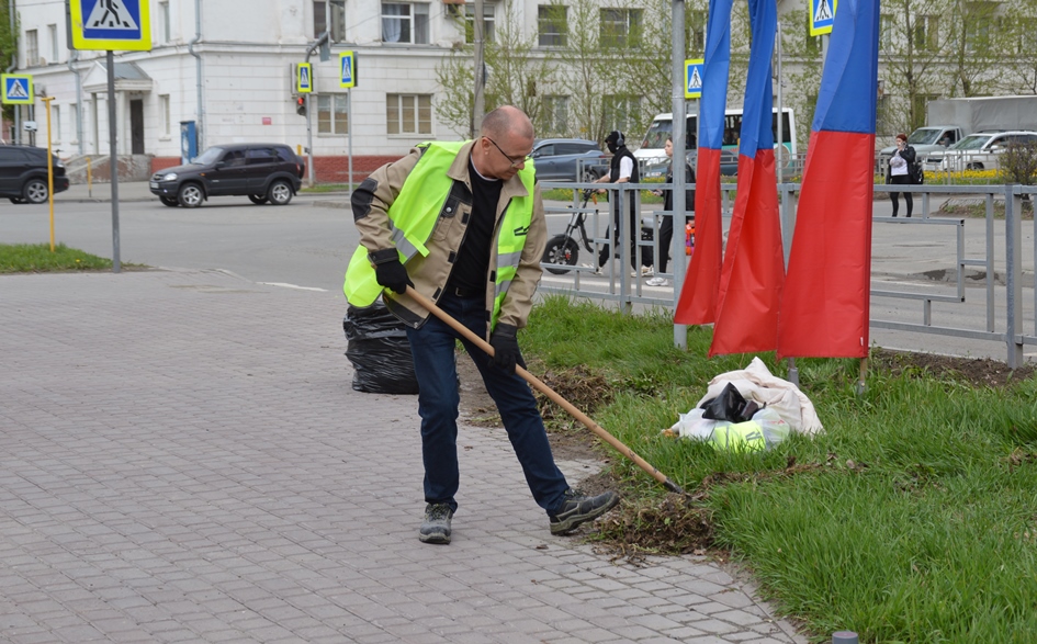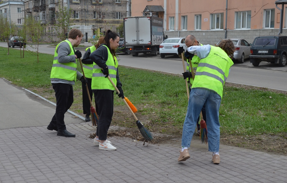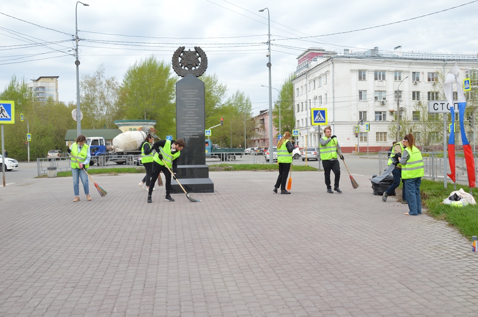 Работники компании помыли стелу, изготовленную из черного камня, подмели прилегающую территорию, очистили газон от прошлогодней листы.