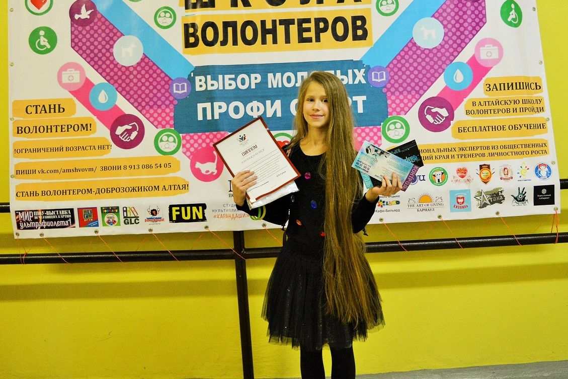 Лучшими волонтерами стали Руслана Руденюк, волонтер из отряда гимназии №69, Серафима Агальцова и Валерия Новикова, волонтеры отряда «Максимум Патриотизма» с.Березовка Первомайского района, Кристина Пономарева, волонтер отряда гимназии №123, Елена Фетисова, волонтер отряда школы №103 и Екатерина Буханова, волонтер отряда из с.Полковниково Косихинского района Алтайского края.